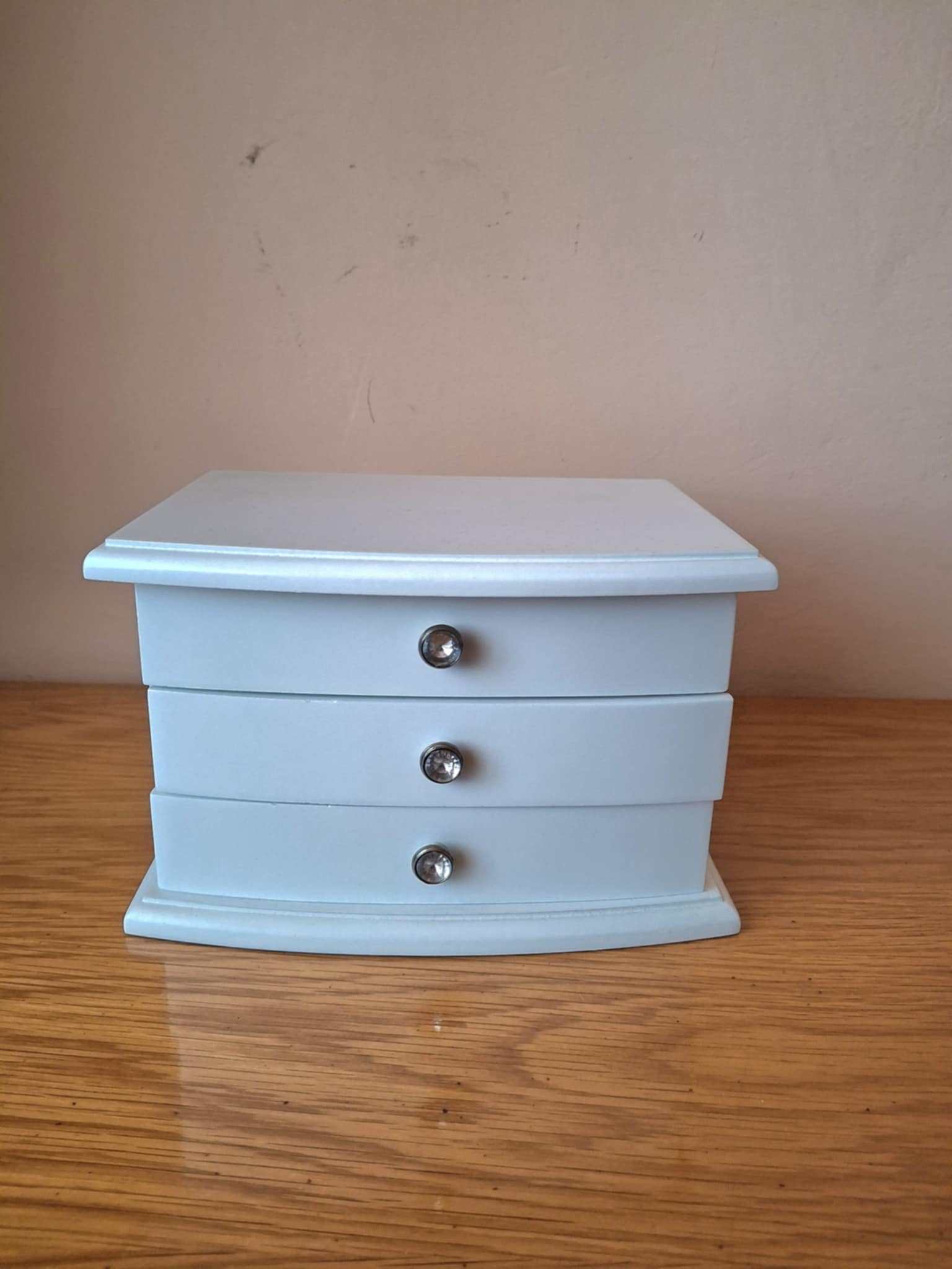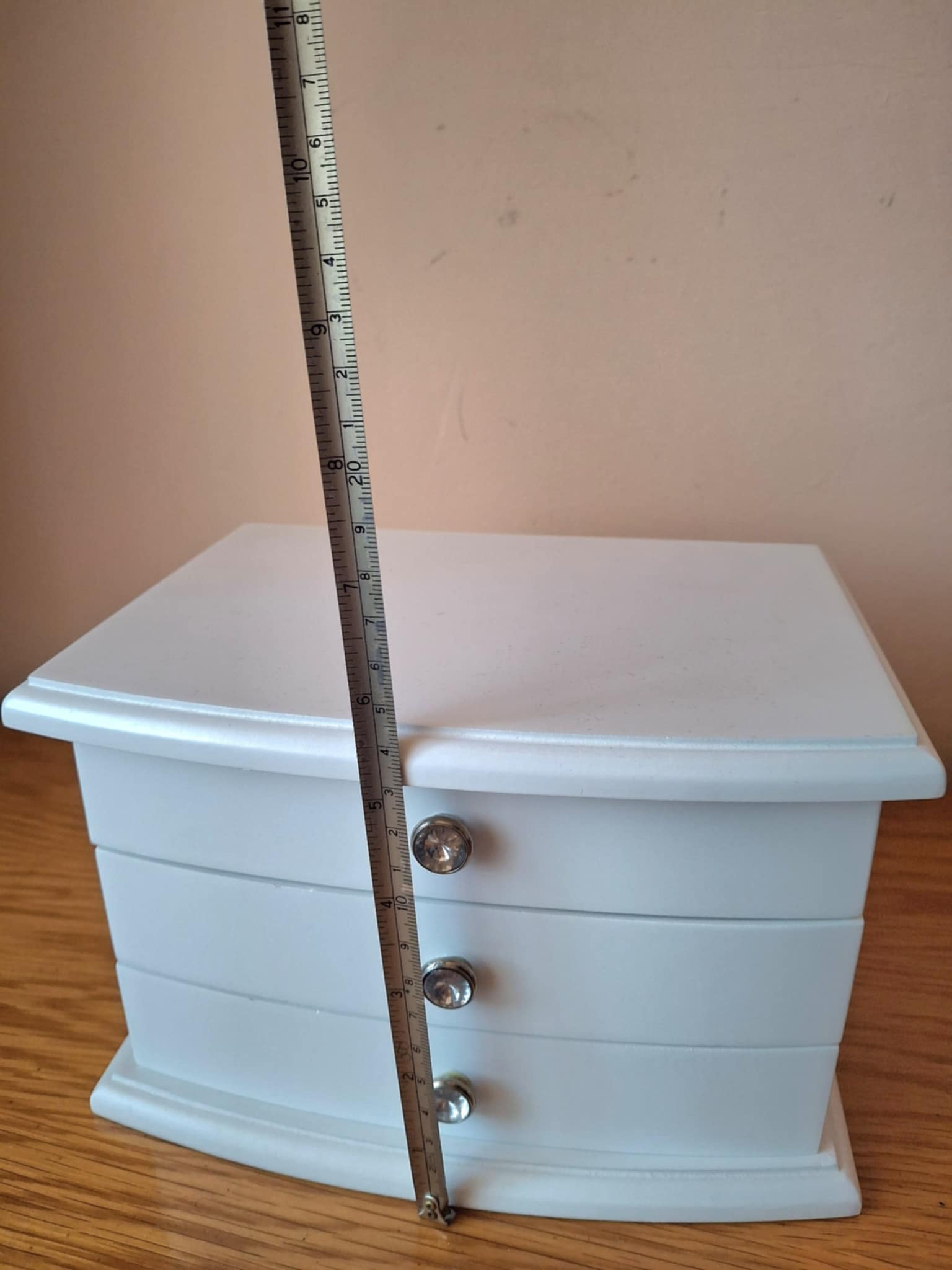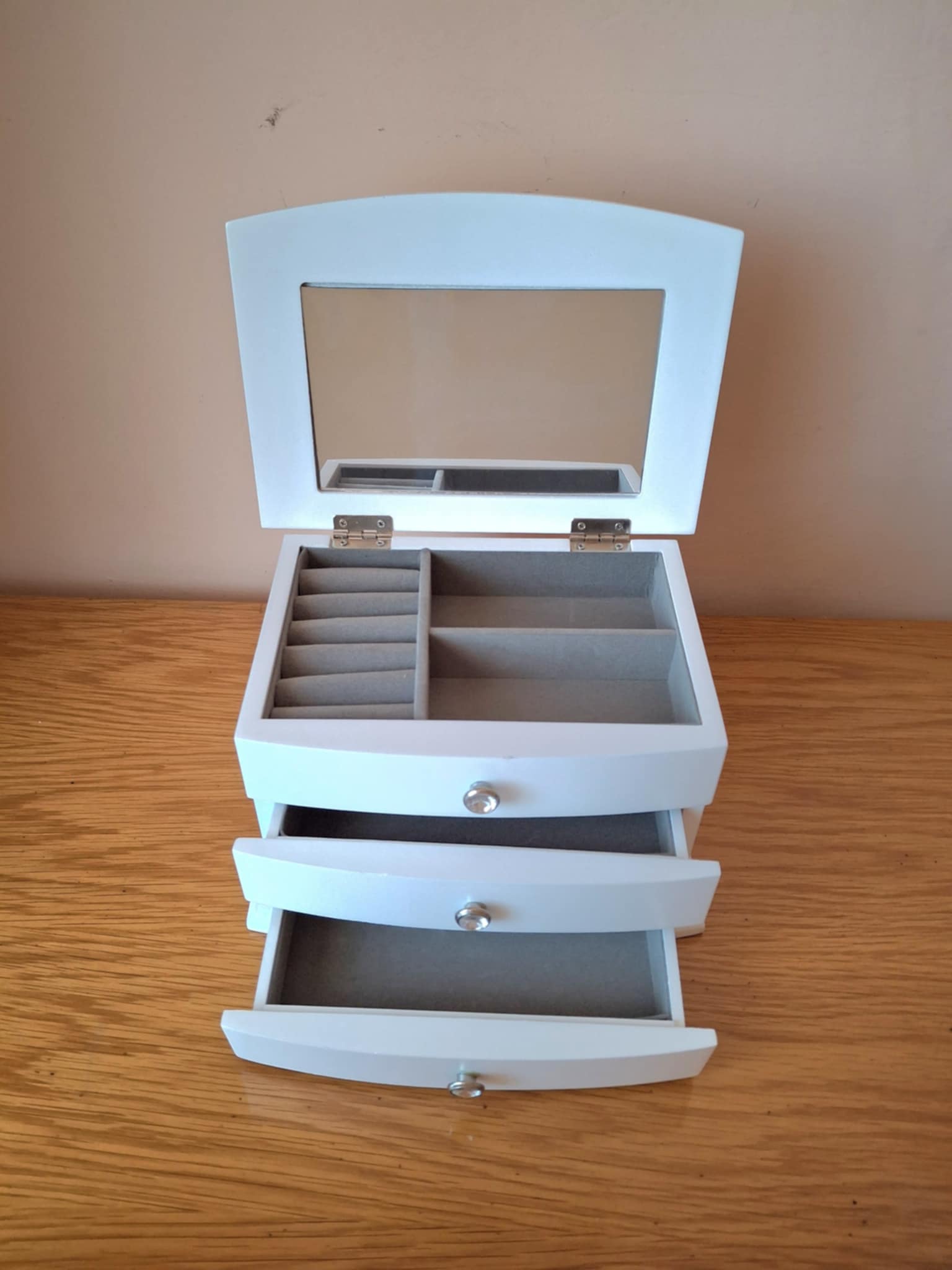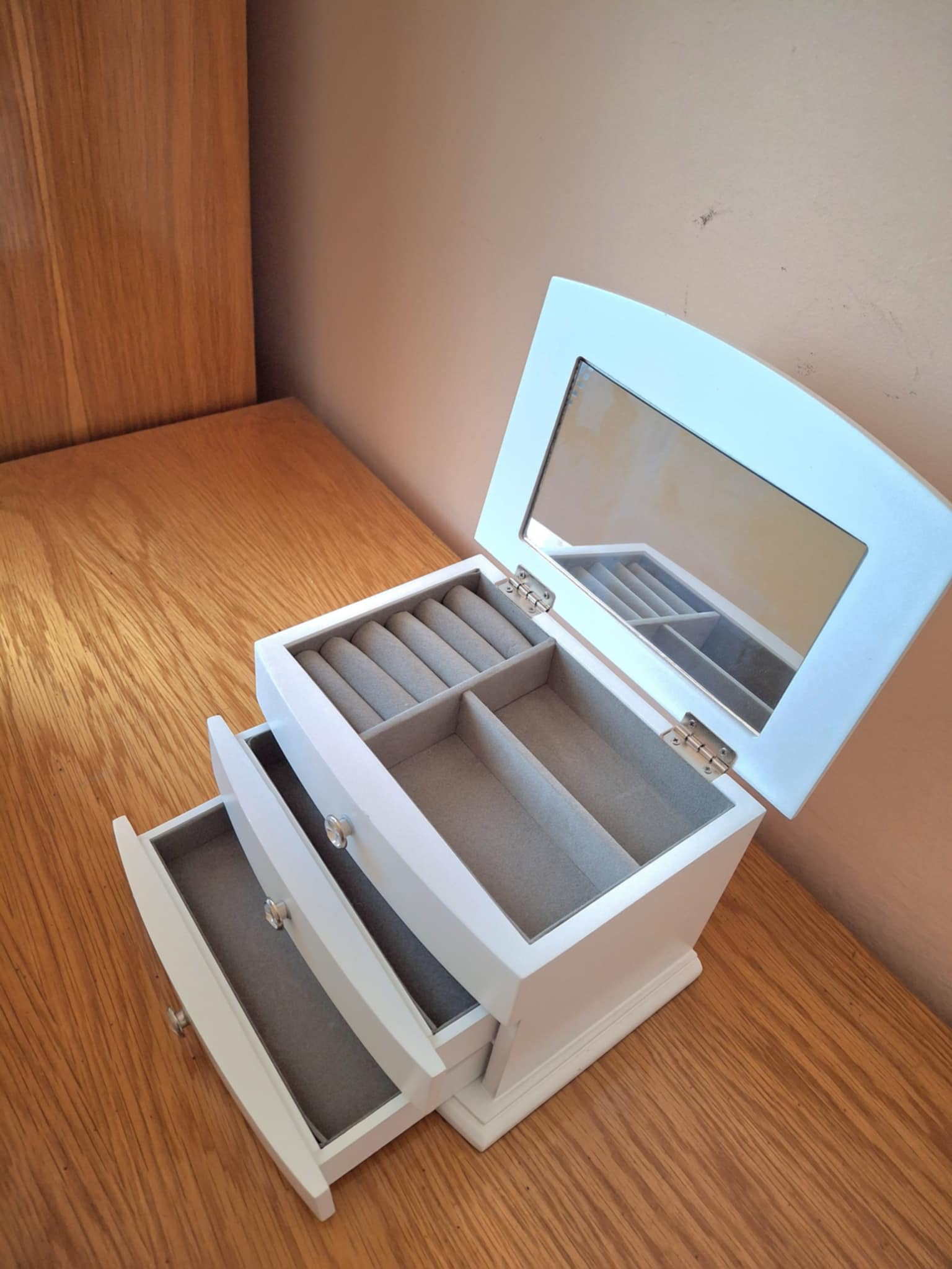Cutie pentru bijuterii, cu sertare şi oglindă, culoare albă Are 3 etaje, 2 sertare şi partea de sus cu capac. Material: lemn Dimensiuni: ȋnălţime: aprox. 15 cm, lăţime: aprox. 15 cm, lungime: 22 cm