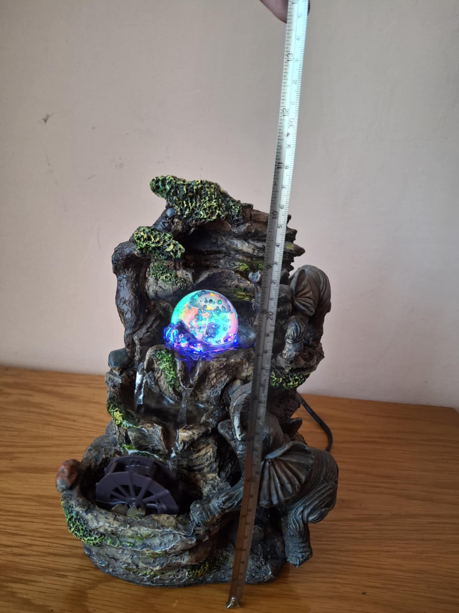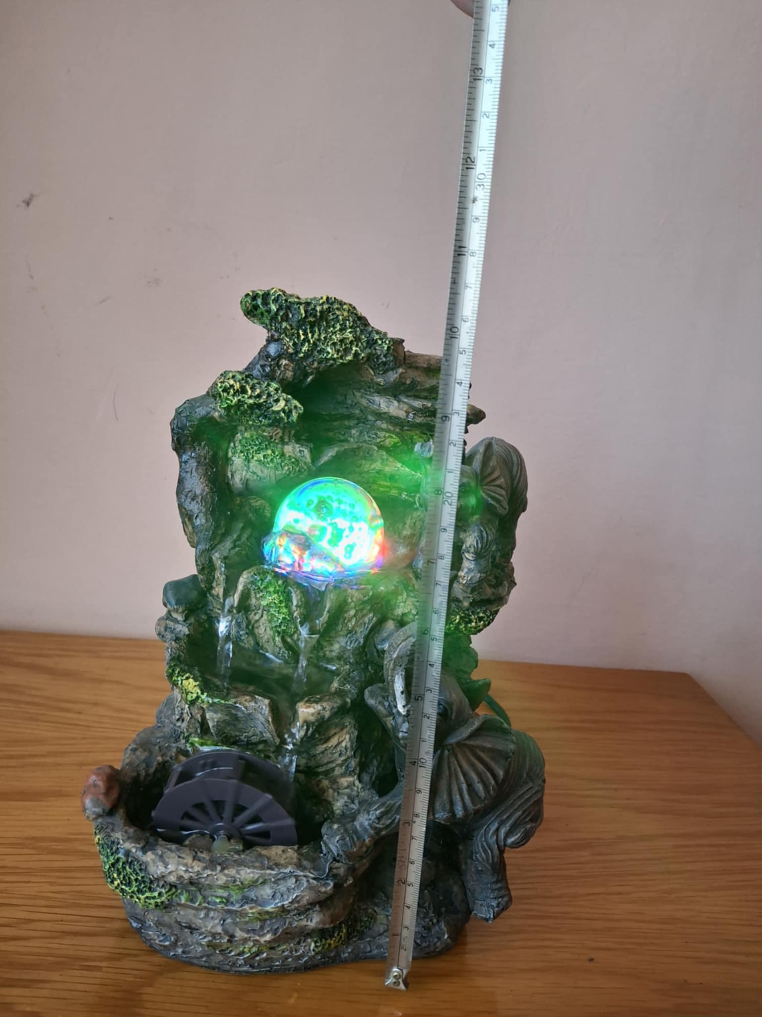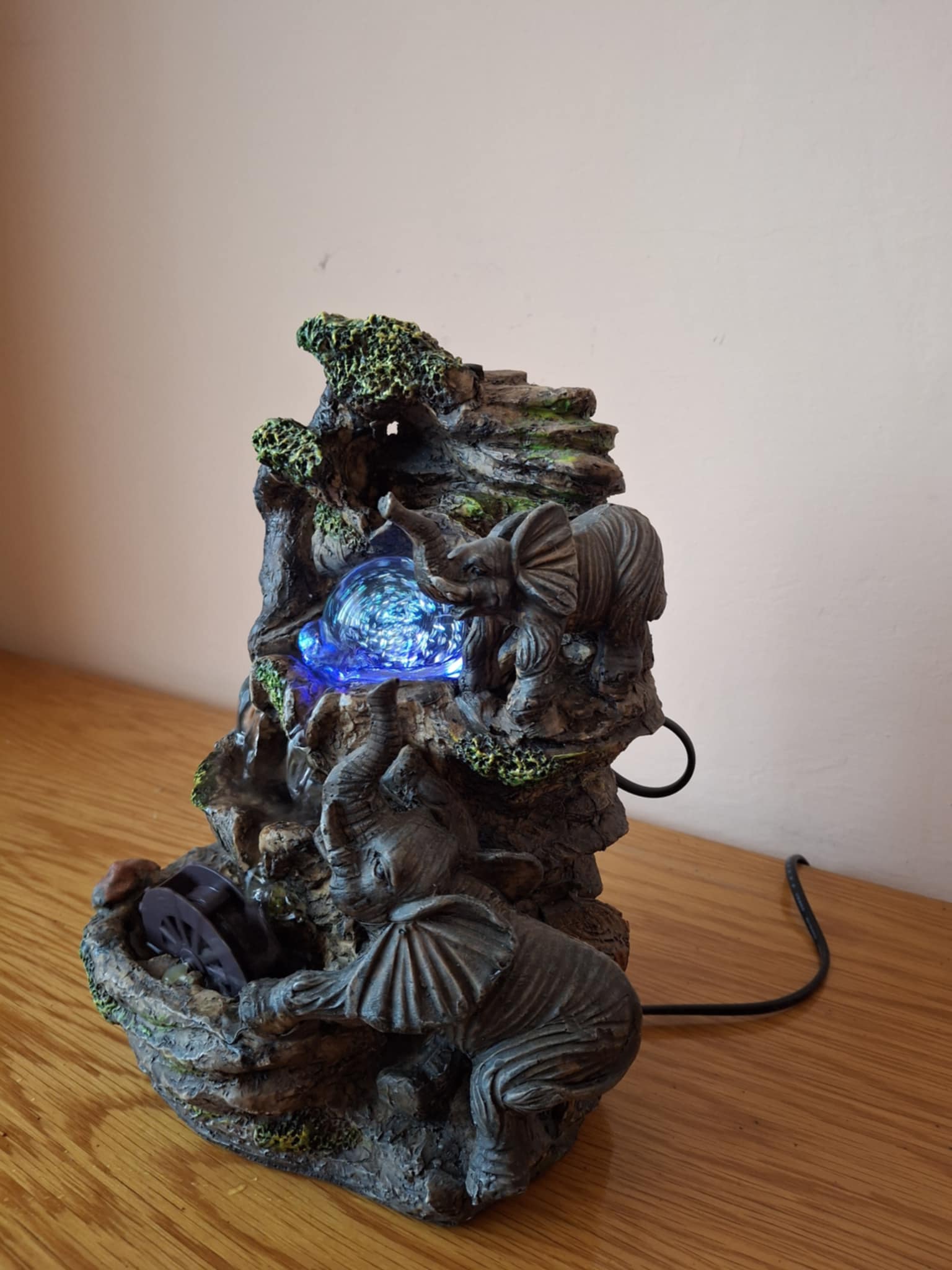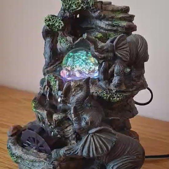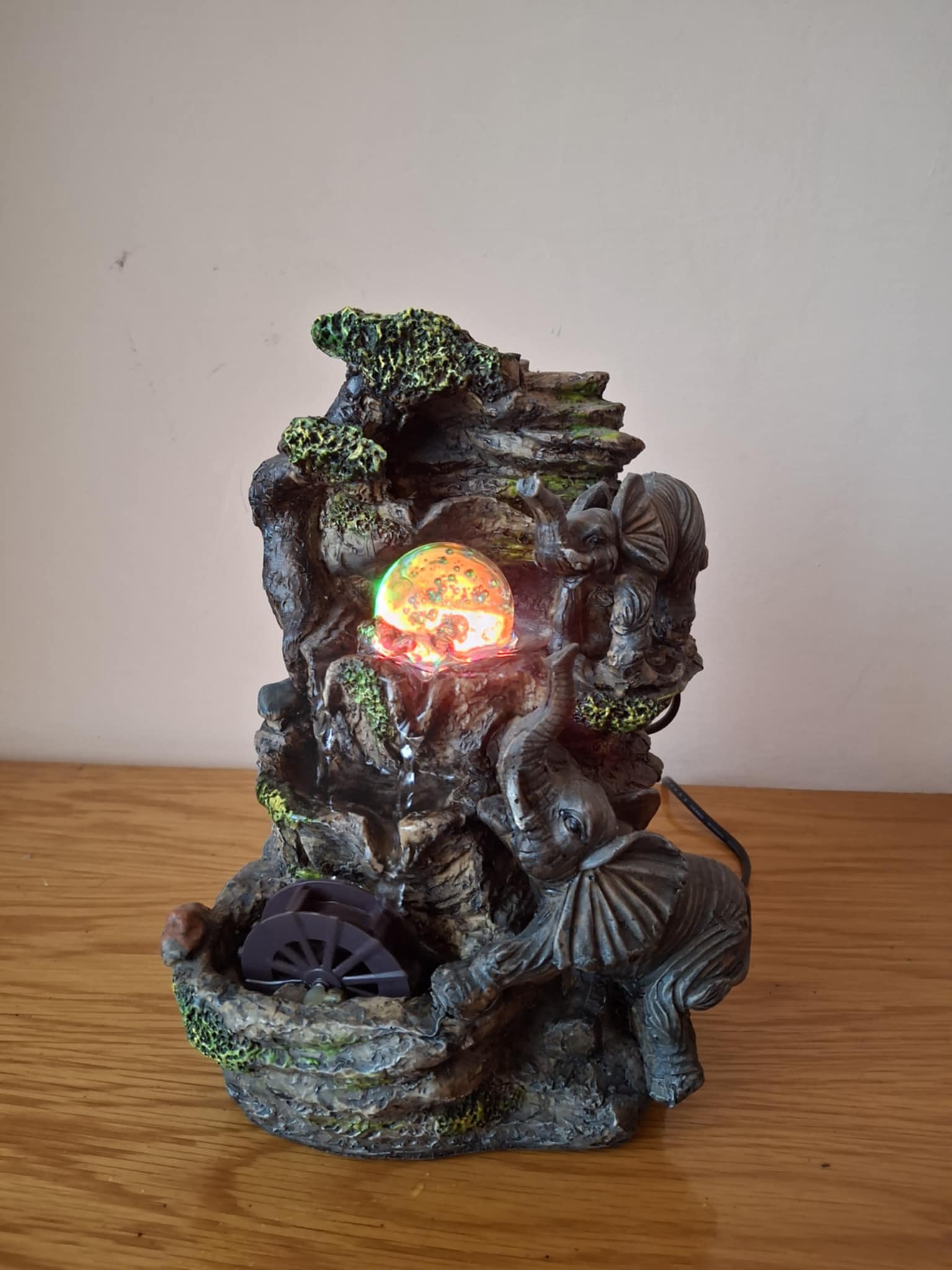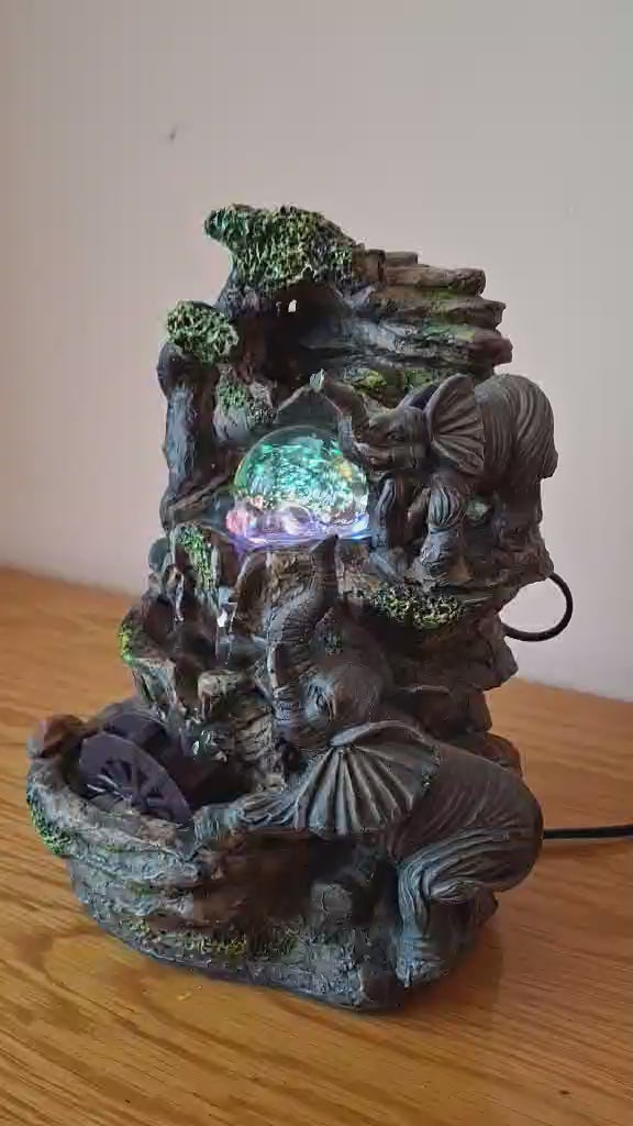 Fântână arteziană cu elefanţi şi lumini colorate Superbă fântână, funcţionează cu apă, care ȋnvârte roata şi bila de sticlă şi care generează lumini colorate prin bilă. Funcţionează la curent - la priză. ȋnălţimea: aprox. 26 cm, lăţime: aprox. 18 cm